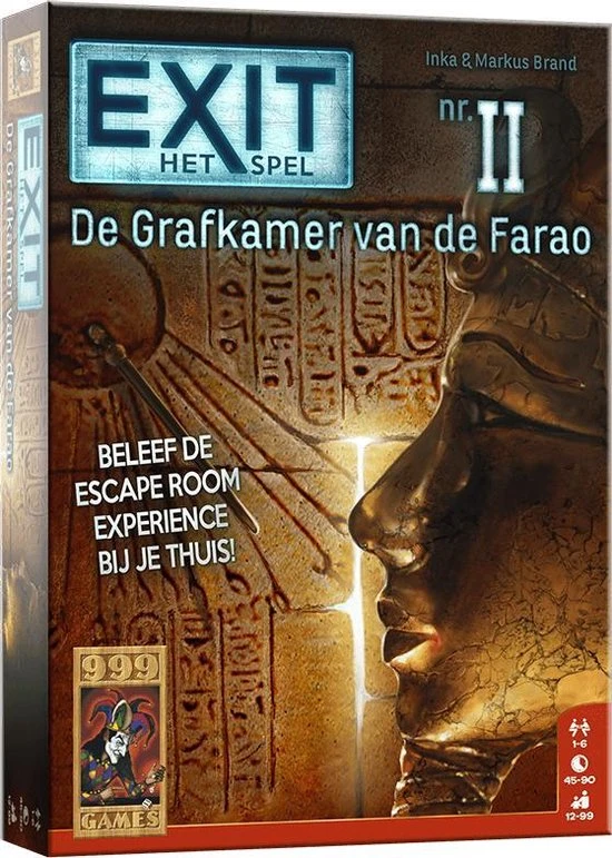 Het uitdagende co?peratieve escape room-spel! Ontsnap zo snel mogelijk uit de griezelige grafkamer. Probeer binnen anderhalf uur alle puzzels op te lossen en alle codes te breken. Alleen dan ontsnappen jullie uit de locatie waar jullie opgesloten zitten. Logisch nadenken en doorzettingsvermogen zijn vereist om dit spel tot een goed einde te brengen. En komen jullie er echt niet uit, dan bevat het spel tipkaarten om jullie op het goede spoor te brengen. EXIT: De Grafkamer van de Farao is maar ??n keer speelbaar omdat het speelmateriaal moet worden beschreven, gevouwen of afgescheurd. Maar net als in een “echte” escape room garanderen we een zeer intense puzzel- en speelervaring! De puzzels zijn vrij pittig. Daardoor is het spel vooral geschikt voor fervente puzzelaars en escape room-liefhebbers. Niveau: professional