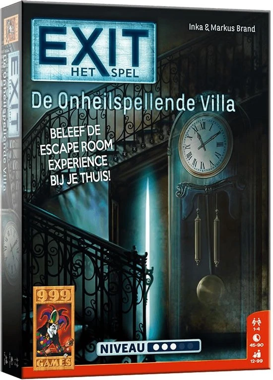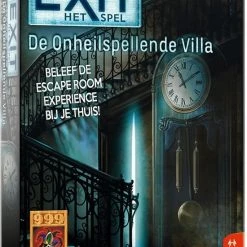 Ontsnap uit een onheilspellende villa. Probeer binnen anderhalf uur alle puzzels op te lossen en alle codes te breken. Alleen dan lukt het jullie om uit de angstaanjagende villa te ontsnappen. Logisch nadenken en doorzettingsvermogen zijn vereist om dit spel tot een goed einde te brengen. En komen jullie er echt niet uit, dan bevat het spel tipkaarten om jullie op het goede spoor te brengen. EXIT: De onheilspellende villa is maar ??n keer speelbaar omdat het speelmateriaal moet worden beschreven, gevouwen of afgescheurd. Maar net als in een ?echte? escape room garanderen we een zeer intense puzzel- en speelervaring! De puzzels zijn vrij pittig. Daardoor is het spel vooral geschikt voor fervente puzzelaars en escape room-liefhebbers.