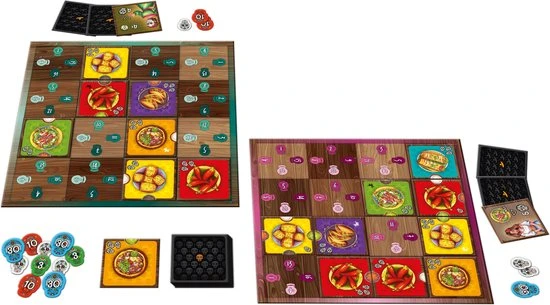 | Verpakkingsinhoud | Inhoud:, 4, tafeltableaus, 66, gerechtentegels, 24, wenskaarten, 56, puntenfiches, De, spelregels |