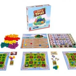In Juicy Fruit ga je op je eigen eiland fruit oogsten. Met je fruit laad je schepen op je eiland vol, zodat kostbare grond beschikbaar wordt. Ook scoor je punten door bedrijven op je eiland op te zetten. Elke speler heeft een eilandtableau, met daarop vijf verschillende fruittegels. Per beurt schuif je een fruittegel naar keuze in een rechte lijn naar een nieuwe plaats. Voor elk vakje dat je met deze fruittegel hebt kunnen schuiven, krijg je fruit van dezelfde soort in je voorraad. Dit fruit ga je gebruiken voor het vullen van schepen en het opzetten van bedrijfjes, zoals ijssalons. Zolang de schepen niet vol zijn, nemen ze ruimte op je eiland in. Maar als je teveel op schepen focust, halen je tegenstanders misschien net de bedrijven weg die jij nodig hebt. Grote ondernemingen die veel punten waar zijn, bezetten delen van je eiland waardoor je minder ruimte hebt om met de fruitstukken te schuiven. Juicy Fruit ziet er kleurrijk en vrolijk uit, maar biedt stiekem behoorlijk wat tactische uitdaging. Het spel heeft meerdere varianten, zoals verschillende solomodi en een extra element in de vorm van de juicefabriek.