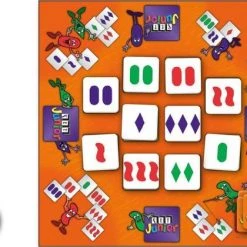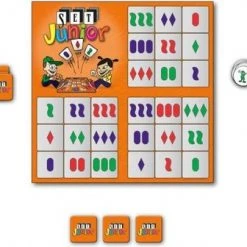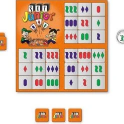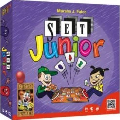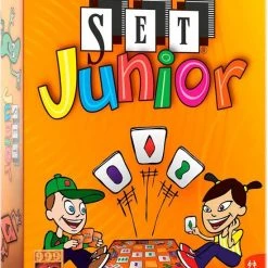 Vereenvoudigde versie van het populaire combineer- en reageerspel SET. Dit spel, dat al geschikt is voor kinderen vanaf 5 jaar, bevat twee versies. Aan de ene kant van het speelbord leg je tegels op overeenkomstige afbeeldingen en krijg je punten als je de op het speelbord afgebeelde SETs afbouwt. Op het andere speelbord kun je het welbekende combineerspel spelen met 3 eigenschappen in plaats van 4. Als je dit beheerst, kun je het basisspel SET eens proberen!