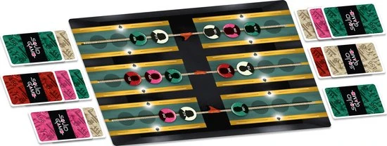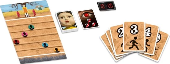 Red Light Green Light – In dit spel moet je jouw teamleden naar de overkant van het speelbord laten lopen. Het cijfer op de kaart die je per beurt speelt, geeft aan hoeveel stappen je teamleden mogen doen. Draai daarna een kaart van de gevreesde pop om. Als die kaart hetzelfde cijfer laat zien, wordt jouw voorste teamlid uitgeschakeld.
