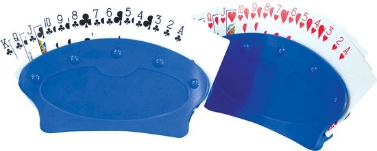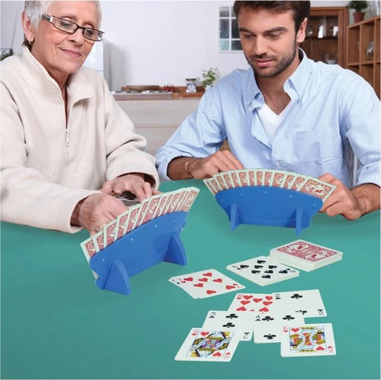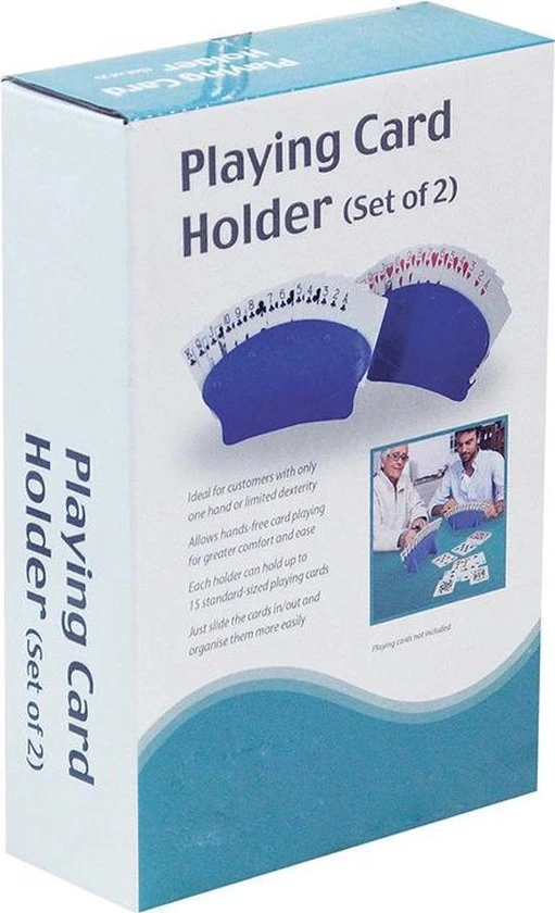 Dit paar speelkaarten houders is ideaal voor hands-free kaarten. Plaats in elke houder tot wel 15 kaarten om ze zonder handen overzichtelijk te zien en te organiseren. De kaarten glijden gemakkelijk in en uit de houder. De kaarthouder kan staan, liggen of eenvoudig in ??n hand worden gehouden. De onderzijde van de houder is glad en voorkomt krassen op tafels. Een ideaal formaat houder voor bijvoorbeeld poker, pesten, klaverjassen of andere kaartspellen. Heeft u beperkte beweeglijkheid, handklachten of ??n hand, dan is dit een ideale oplossing. Hierdoor kunnen gebruikers genieten van dit leuke tijdverdrijf met comfort, gemak en een grotere onafhankelijkheid. Let op: speelkaarten niet meegeleverd.