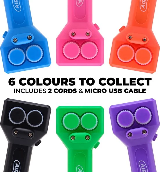 Air Magic, 2 kleuren touwtjes (assorti roze / oranje / blauw / groen) en micro USB oplaadkabel.