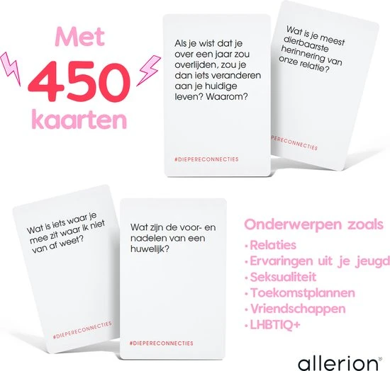 Of je nu op een eerste date gaat, of al 30 jaar getrouwd bent, goede gesprekken zijn altijd erg waardevol. Met het Diepere Connecties kaartspel heb je 450 verschillende onderwerpen om over te praten. Deel je meest intieme momenten met de mensen die je vertrouwt. Geschikt voor alle soorten relaties, van eerste date tot huwelijk en LHBTIQ+ relaties. Perfect als cadeau!