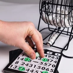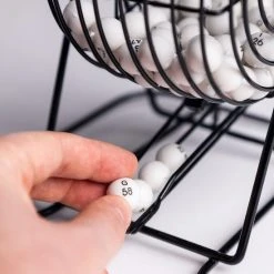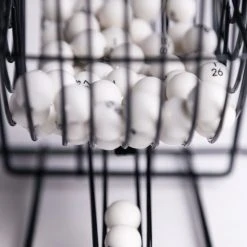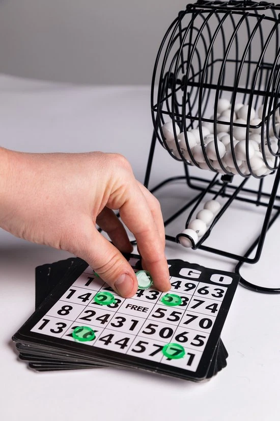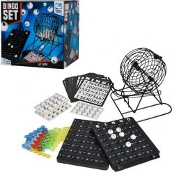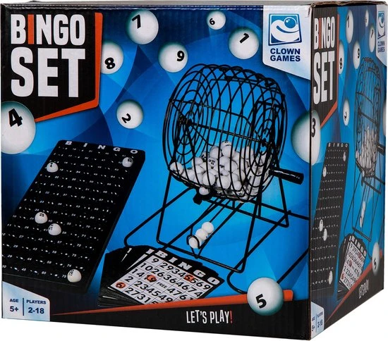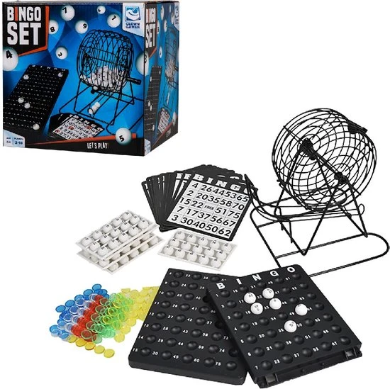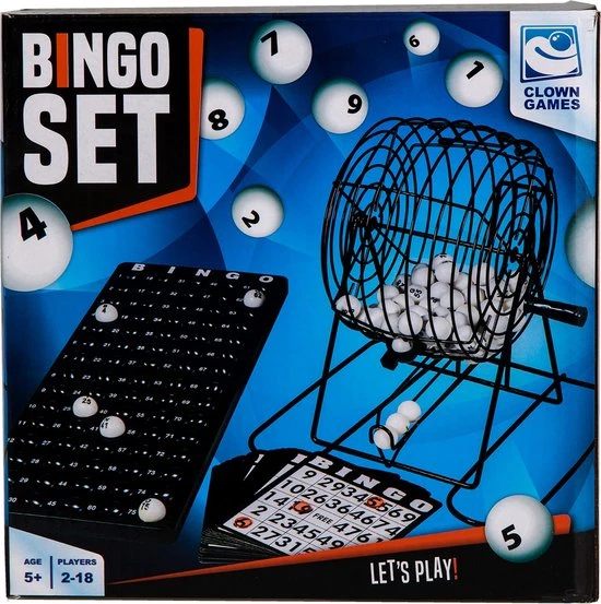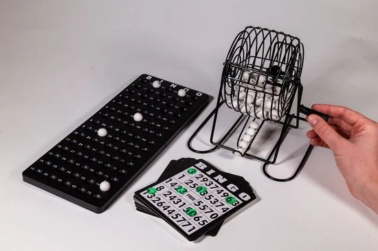 | Verpakkingsinhoud | 1, bingomolen, 18, herbruikbare, bingokaarten, Balletjeshouder, 75, genummerde, balletjes, Ca., 150, bingofiches |
