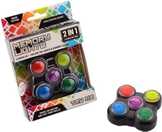 Memory Volgspel 2 In 1 met licht en geluid. Onthoud de volgorde waarin de lampjes oplichten en herhaal deze op de juiste manier. Geschikt voor kinderen vanaf 3 jaar.