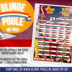 Speel de Blinde Poule tijdens het WK 2022 voetbal samen met vrienden, collega’s of familie. Het is erg simpel, kies een wedstrijd naar keuze van het Nederlands elftal. Bepaal vooraf de inleg voor elk ingevulde vakje. Vul je naam in op een door jou gekozen vakje. Check na afloop van de wedstrijd de uitslag op het meegeleverde uitslagformulier. Staat de juiste uitslag onder jouw naam en vakje? Dan ben jij de winnaar!