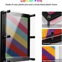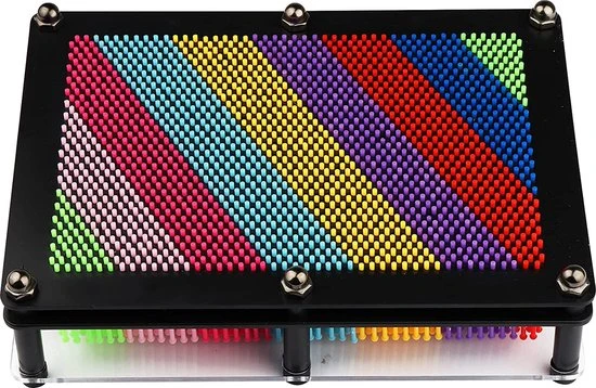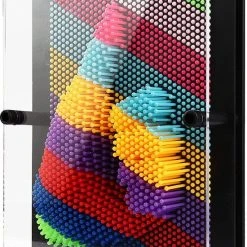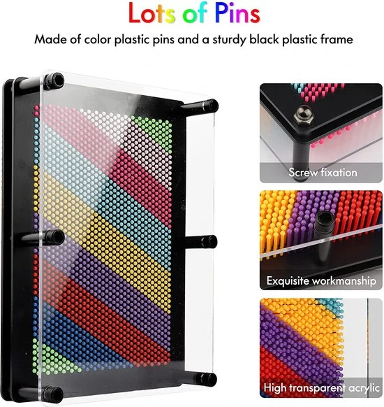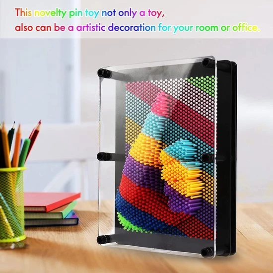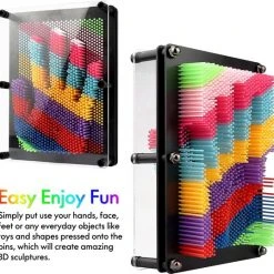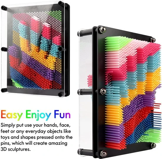 Dit is een geweldig product ofwel voor jezelf of voor een gift, stevig frame met dicht bij 1000 plastic pinnen steken van de rug, iets geperst in de pinnen zal cre?ren verbazingwekkende 3-dimensionale sculpturen. Gebruik uw handen, gezicht, voeten, of een dagelijks object te cre?ren verbluffende visuele sculpturale effect.