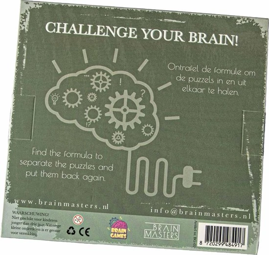 Kun jij ook geen genoeg krijgen van puzzelen en denk je dat jij onze nieuwe Brain Games aankunt? Deze 12 unieke puzzels geven je uren spelplezier voor jezelf, familie en vrienden. Ontrafel de formule om de puzzels in en uit elkaar te halen. Elke puzzel geeft je een nieuwe uitdaging om je concentratievermogen, geheugen en focus te verbeteren. Klinkt makkelijk toch? Pas maar op, het is moeilijker dan het er uit ziet.