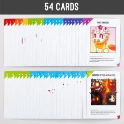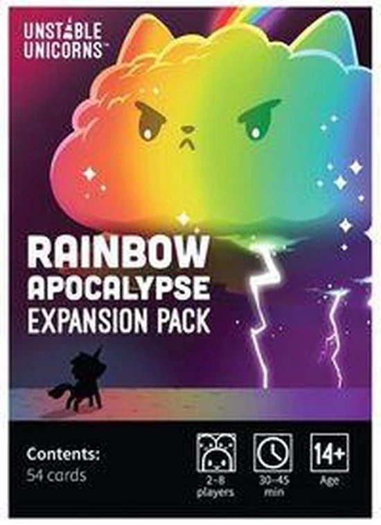 De Unstable Unicorns Rainbow Apocalypse uitbreiding komt met 54 nieuwe kaarten die de wereld verpulveren. De 54 kaarten worden opgesplitst in 27 verwoestende kaarten en 27 apocalyptische kaarten. Elk van deze kaarten heeft een unieke Unicorn twist op monsters en apocalyptische gebeurtenissen uit de popcultuur.