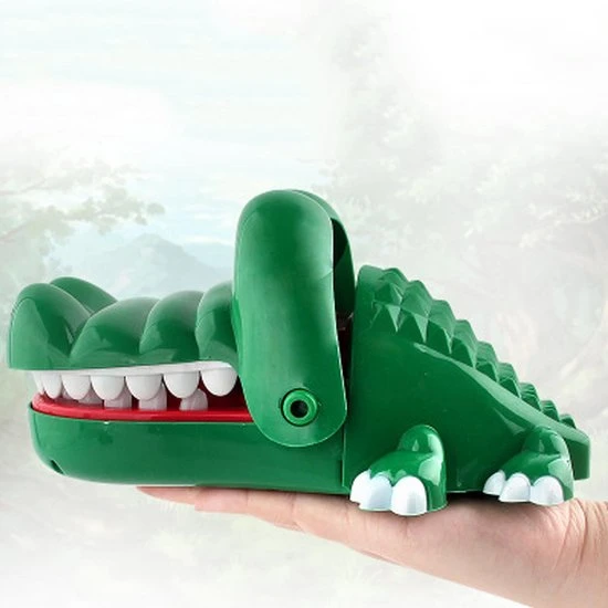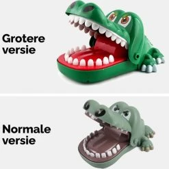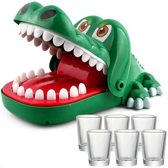 Het bijtende krokodil spel is een leuk spannend spel op puur geluk. Er word een willekeurige tand aangewezen waaraan de krokodil kiespijn heeft. Elke speler moet na elkaar 1 tand indrukken. Wanneer jij de zere tand aanraakt zal de krokodil bijten en heb jij het spel verloren. Hierbij moet de verliezer een shotje nemen. Hierbij is alcohol onder de 18 niet toegestaan. Het spel is daarbij ook uitsluitend geschikt voor mensen boven de 18.