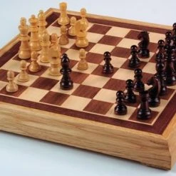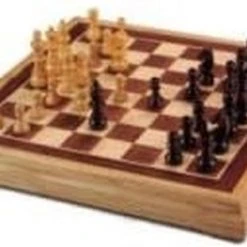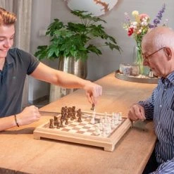 Luxe houten uitvoering van het schaakspel. Het schaakbord heeft de afmetingen 40×40 cm. Het schaakspel is inclusief speelstukken, de hoogte van de koning is 77 mm. Het schaakbord is gemaakt van berkenhout, de schaakstukken zijn van essenhout.Incl. opbergsysteem aan de achterkant van het bord.