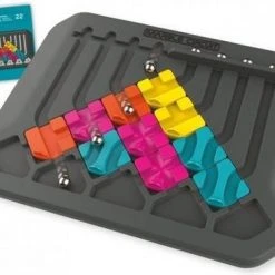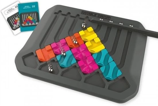 Voorspel de paden van de knikkers en voeg de resterende mysterytegels toe zodat het aantal knikkers dat in de vijf doelvelden verzameld wordt, overeenkomt met de uitdagingkaart.