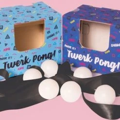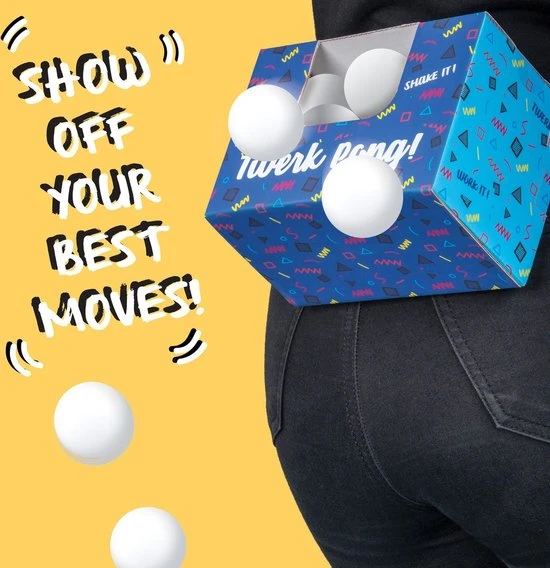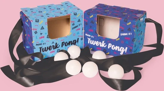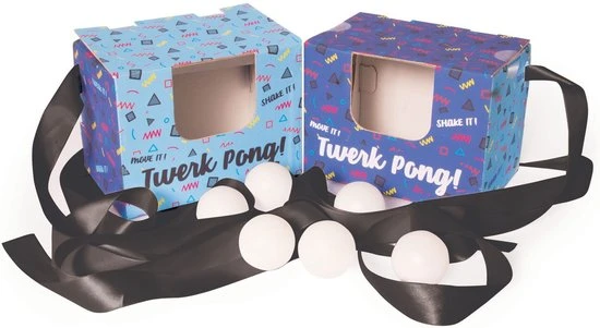 Twerk Pong van Fizz. Spel om zo hard mogelijk te twerken. Met twerk pong is het de bedoeling om de pingpongballen uit het doosje te twerken. Spel om samen te spelen om feestjes. Twerk Pong bevat twee doosjes, twee linten en tien pingpongballen. De Twerk Pong doosjes moeten nog even in elkaar worden gezet. Twerk Pong om te spelen op vakantie, studentenfeestjes en andere gelegenheden.