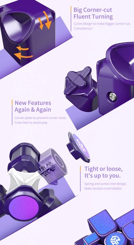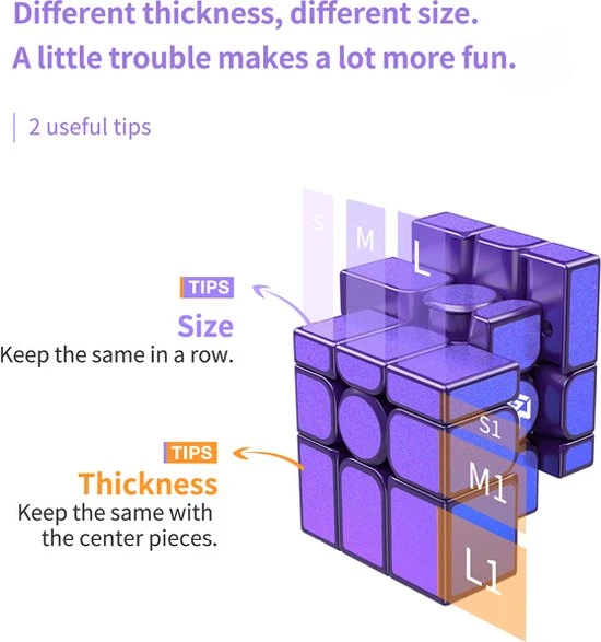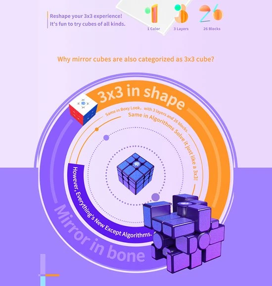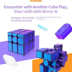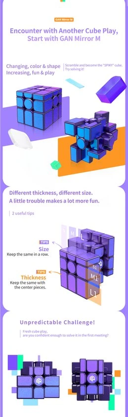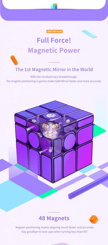 De GAN Mirror M is de nieuwe magnetisch mirror van GAN! Met een prachtige paarse basis met glitterblauwe/paarse stickers, maakt deze cube ook nog eens een prachtig pareltje om te zien! Dit is een speedcube die is gebouwd met snelheid in het achterhoofd. Deze beschikt over 48 magneten in de stukken, een schroef/veerspansysteem, geweldige hoeken en paars plastic gecombineerd met paars/blauwe metallic stickers. Als je een 3?3 kunt oplossen, kun je de Mirror ook oplossen. Probeer het eens en kijk hoe snel je deze kunt oplossen! De GAN Mirror Magnetic geeft een moderne draai aan een klassieke puzzel.