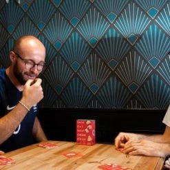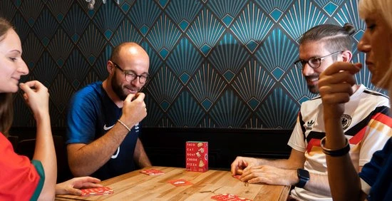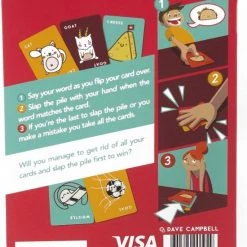 Taco Cat Goat Cheese Pizza ! (Taco Kat Geit Kaas Pizza!) Houd deze 5 gekke woorden in gedachten. Zodra er een match is tussen een kaart en een gesproken woord, moet je het snelst met je hand op de centrale kaartenstapel meppen. De laatste speler moet alle kaarten oprapen. Wees er snel bij om als eerste al je kaarten kwijt te raken. Maar pas op! Je geest kan je voor de gek houden. Dit verslavende spel is net zo uniek als zijn naam. Veel plezier! De internationale handleiding bevat ook uitleg in het Nederlands..