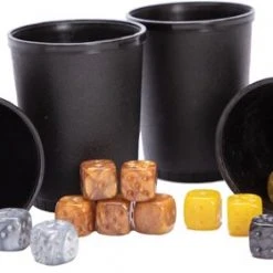 - Schud de dobbelstenen in de dobbelbeker en zet de beker op zijn kop of de tafel neer, zodat alle dobbelstenen erin gevangen zitten.