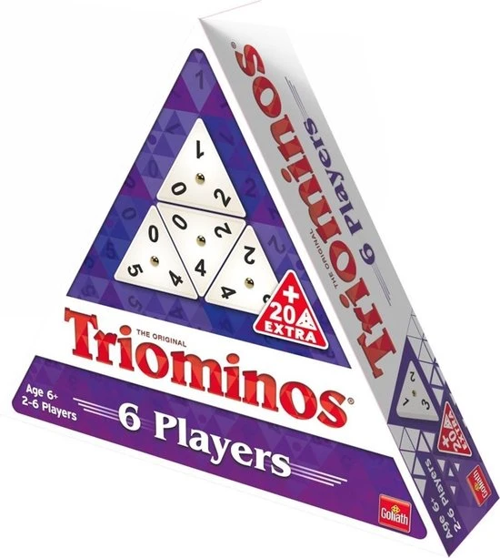Een handige uitbreiding op het originele Triominos spel! Nu kun je tot wel 6 spelers spelen. Een tactisch spel met driehoekige, genummerde stenen. Zoek je kansen, leg ze snel aan en scoor zo veel mogelijk punten. Bij dit spel gaat het niet alleen om inzicht maar ook om tactisch spelen; Sommige aangelegde figuren leveren je namelijk ook veel punten op!