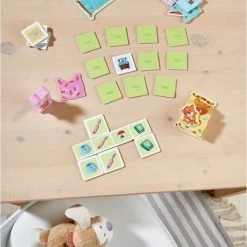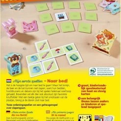 ‘Naar Bed‘ van Haba is een leuk ordenings- en geheugenspelletje over slapengaan, afgewerkt in hout en stevig karton! Het is de hoogste tijd om naar bed te gaan! Maar het konijn, de beer en de kat kunnen niet slapen, want hun bedden, hoofdkussens en dekens zijn helemaal overhoop gehaald. Bovendien wil elk dier ook absoluut zijn favoriete knuffeldier. Wanneer de kinderen een goed geheugen en een beetje geluk bij het omdraaien van de plaatjes hebben, slagen ze erin om de dieren snel naar bed te brengen. Korte instructies: