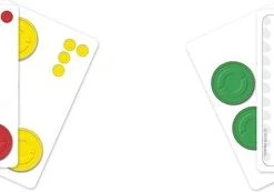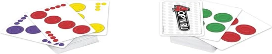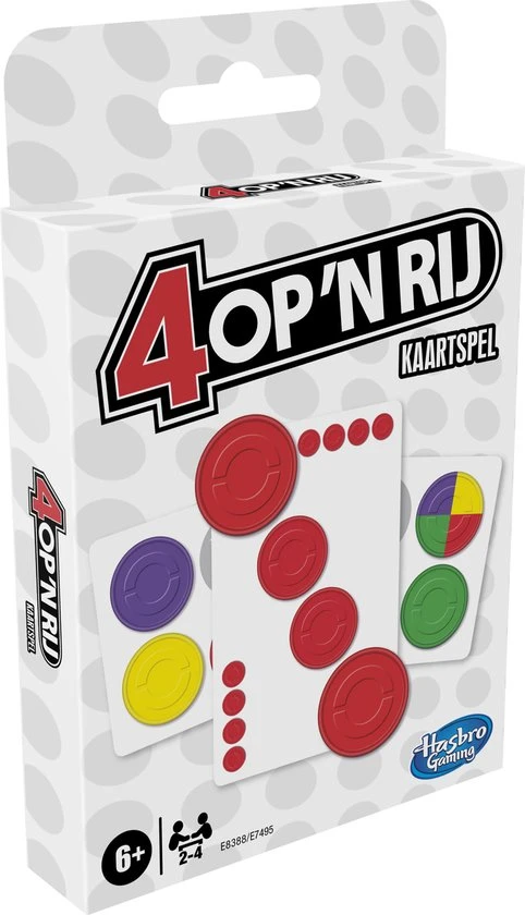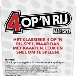 Het klassieke 4 op ‘n rij-spel is er nu ook in de vorm van een leuk kaartspel dat je snel kunt spelen! In deze versie van 4 op ‘n rij kies je 2 missiekaarten van de stapel en houd je de patronen geheim. Daarna neem je 4 op ‘n rij-schijven en moet je proberen om patronen te maken die overeenstemmen met je missies. Het spel is altijd spannend, of je nu 4 op een rij met paars moet maken, een vierkant met groen moet verkrijgen of schijven combineren tot een L-vorm met geel. Als je een schijfkaart met een power-upsymbool trekt, kun je een eenmalige actie uitvoeren die het verloop van het spel in een oogwenk kan veranderen. Je moet 4 missies volbrengen om te winnen. Dit kaartspel is snel te spelen en praktisch voor kinderen om hun 4 op ‘n rij-spel onderweg of naar het huis van een vriend mee te nemen.