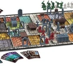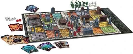 Includes gameboard, 31 monster miniatures, 4 hero miniatures, 15 furniture pieces, 10 skull pieces, 4 plastic rat pieces, 21 dungeon doors, 93 game cards, 4 turn-order cards, cardboard tiles, Quest Book, 4 character cards, Game Master’s screen, pad of character sheets, 6 white combat dice, 2 red dice, and rulebook.