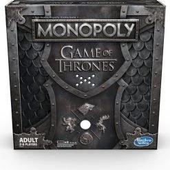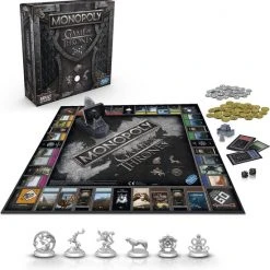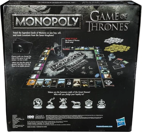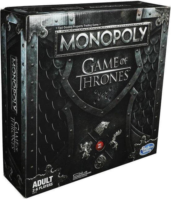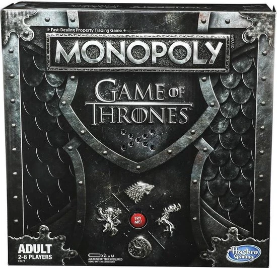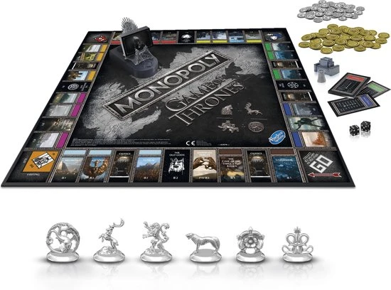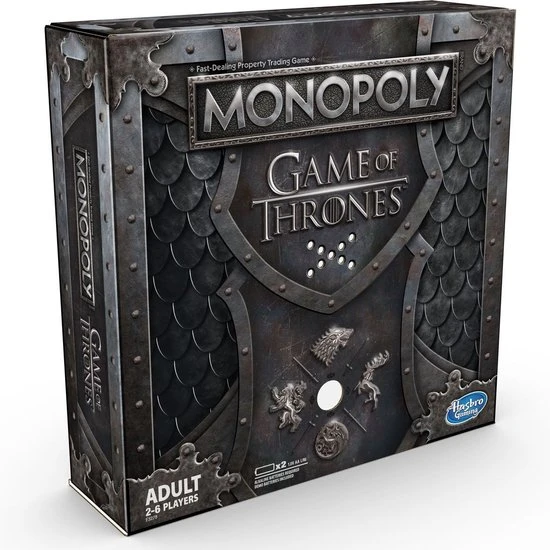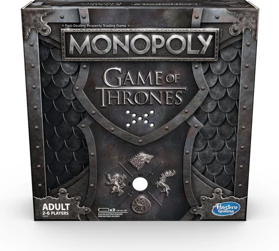 Game of Thrones komt samen met het populaire vastgoedspel voor snelle onderhandelaars in dit Monopoly-spel voor GOT-fans! Het speelbord, de verpakking, de pionnen, het geld, de kanskaarten en de spelonderdelen zijn allemaal ge?nspireerd op de populaire tv-serie van HBO. Verplaats je pion over het bord en koop onderweg zo veel mogelijk Game of Thrones-eigendommen. Hoe meer je er hebt, hoe meer huur je krijgt van je tegenstanders. De laatste speler die geld heeft als alle anderen failliet zijn, wint! Het Game of Thrones Monopoly-spel is een fantastisch cadeau voor fans van de serie.