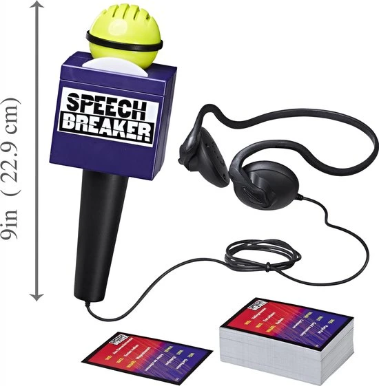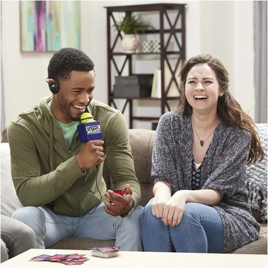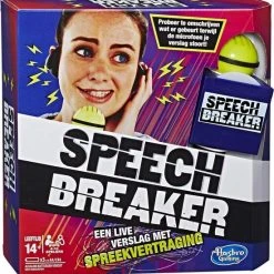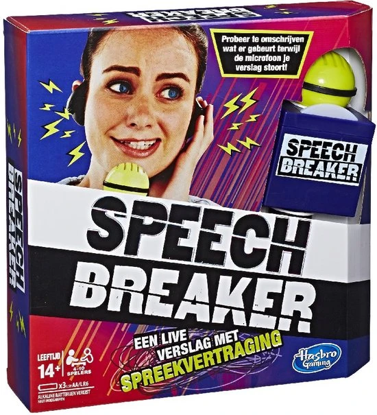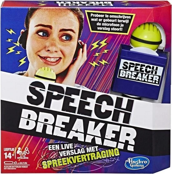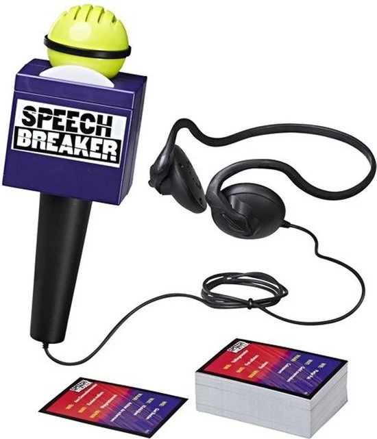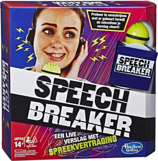 Jij bent de verslaggever ter plaatse! Kun jij je nog verstaanbaar maken? Zet je koptelefoon op, spreek door de microfoon en maak je teamgenoten duidelijk over wie, wat en waar je verslag doet, zonder de woorden op het kaartje te zeggen. Denk je dat dat een makkie is? In de microfoon zit een ingebouwde vertraging die je spraak verstoort. Je hoort alles wat je zegt vertraagd terug door de koptelefoon waardoor het extra lastig is om een duidelijk verhaal te vertellen. Hoe zou jij verslag doen van ?een alien die met gewichten traint in een glazen huis? zonder deze woorden te gebruiken ? en binnen 30 seconden ? als je spraak ook nog eens wordt verstoord?