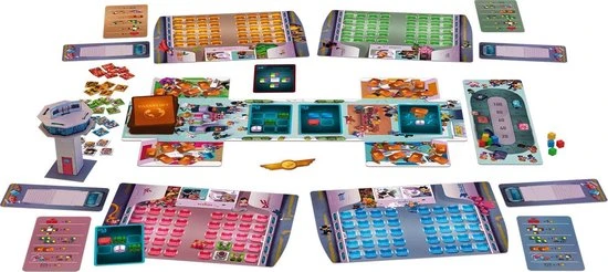 Speelborden, 87 kaarten, 24 voedselbonnen, 150 tokens, 1 verkeerstoren, 1 scorebord voor bagageband, 1 winnaarspeldje, Spelregels.