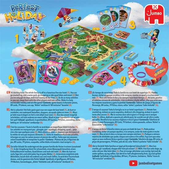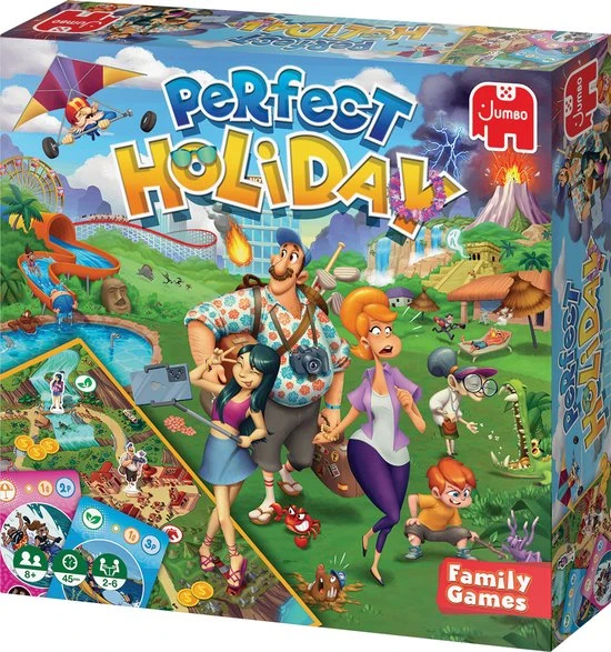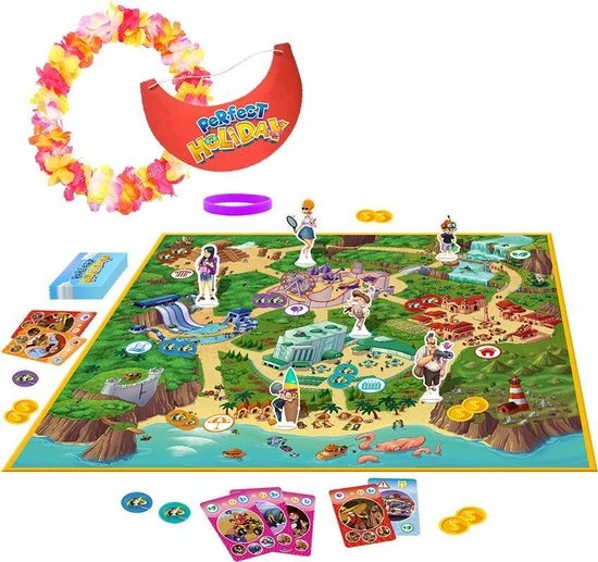 Ga op de ultieme vakantie met het bordspel Perfect Holiday! In dit familie spel neem je het op tegen andere spelers op om de beste vakantie ooit te hebben. Het hele gezin gaat naar een super-de-luxe hotel. Je kunt er snorkelen, een waterpark bezoeken, shoppen en meer! Maar: je hebt maar 6 dagen en het is niet altijd mooi weer. Doe dus zo veel mogelijk activiteiten, ruil met anderen en neem selfies. Maak er jouw topvakantie van en win het spel!