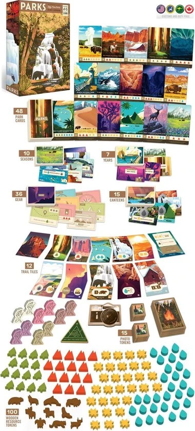 PARKS is a celebration of our National Parks featuring illustrious art from the Fifty-Nine Parks Print Series. Players will take on the role of two hikers as they trek across different trails during four seasons of the year. Each trail represents one season of the year, and with each season?s passing, the trails will change and grow steadily longer. Each turn, players will send one of their hikers down the Trail. While on the Trail, hikers will land on a site?such as seeing Mountain?and takes its action, in this case gaining a Mountain token. When a hiker is on a site, other hikers cannot visit it unless they spend their campfire to share the site. Canteens and Gear can also be used to improve your access to resources through the game. When a hiker reaches the end of the trail they can spend tokens they?ve received from the Trail to visit Parks to earn points. Your goal is to have the most points at the end of the year. Welcome to PARKS!