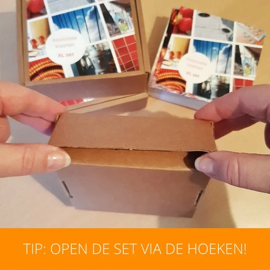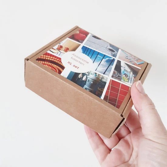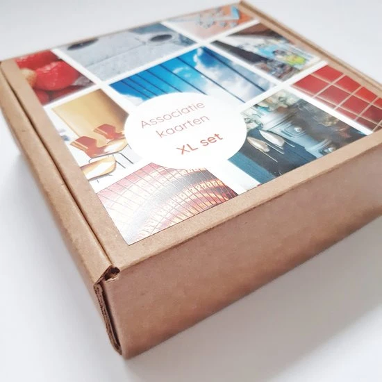 De Associatie kaarten XL set bestaat uit 100 kaarten van 10×10 cm (350grams). Ook deze set bevat diverse afbeeldingen, zoals natuur, dier en voorwerpen. Verpakt in een handig en stevige kraft bewaardoos.
