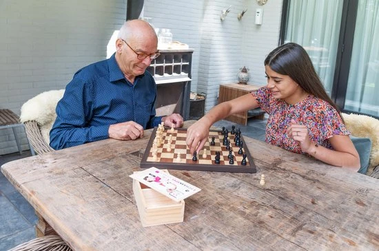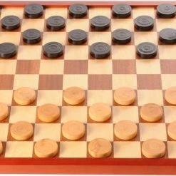 Dam- en schaakbord, ingelegd met hout en afgewerkt met luxe opstaande rand.