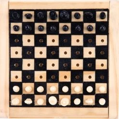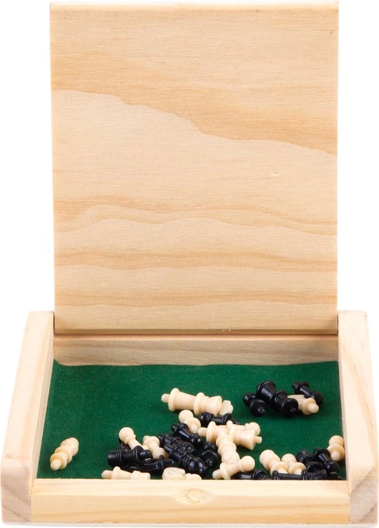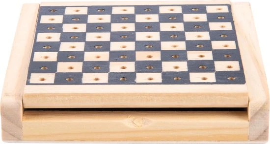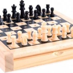 Hiermee kan je overal schaken. Kleinschalig schaakspel van rubberhout wat maar weinig ruimte in beslag neemt. Het schaakbord is 12×12 cm, een enkel schaakvlak is 12×12 mm en de koning heeft een hoogte van 21 mm.