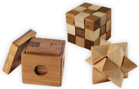 Longfield Set Van 3 IQ Puzzels, Hout, Slangpuzzel, Brain Teaser Star, Brain Teaser Kube 10 X 10 Cm