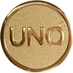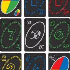 - De gladde zwarte kaarten hebben een luxe uitstraling, maar spelen net als de kaarten van het klassieke UNO-spel. De exclusieve ’50/50′-kaart en de gouden herdenkingsmunt zijn met een speciale regel in het spel opgenomen.