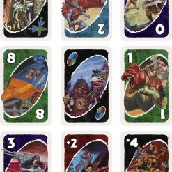 Het UNO kaartspel waar iedereen gek op is, krijgt een stoere look met He-Man? and the Masters of the Universe. Naast dynamische afbeeldingen van MOTU personages, van sterke helden tot dodelijke tovenaars, geldt in deze versie ook een unieke regel: de Power of Greyskull kaart. Om deze kaart te gebruiken, moet de speler de kaart boven zijn of haar hoofd houden en zeggen: “By the power of Greyskull, ik heb de macht!!” Alle andere spelers moeten dan 3 kaarten trekken. Het spel gaat verder precies als het klassieke UNO: spelers moeten kaarten met hetzelfde cijfer of dezelfde kleur opleggen met als doel zo snel mogelijk al hun kaarten kwijt te raken. En vergeet vooral niet triomfantelijk ?UNO? te roepen als je nog ??n kaart over hebt! Deze versie van het populaire kaartspel voor het hele gezin is een geweldig cadeau voor spelers vanaf 7 jaar, vooral voor fans van MOTU. Kleuren en versieringen kunnen vari?ren.