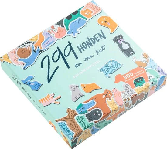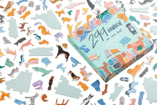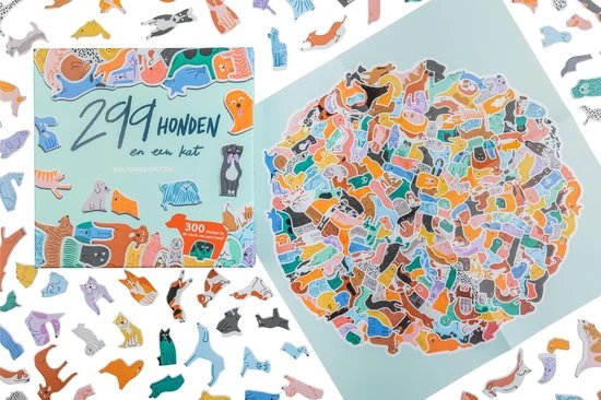 Ben jij in staat om alle 299 honden op de juiste manier in elkaar te passen? De stukjes van deze leuke en bijzondere puzzel hebben geen gewone vorm: elk stukje heeft de vorm van een hond. En het zijn er 299 in totaal! Plus een kat. Kun je die vinden?