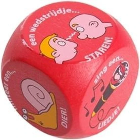 Deze rode grote dobbelsteen heeft een afmeting van ca. 3 x 3 cm en heeft verschillende opdrachten zoals wedstrijdje staren en imiteer een dier. Materiaal: hout.