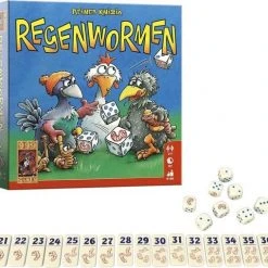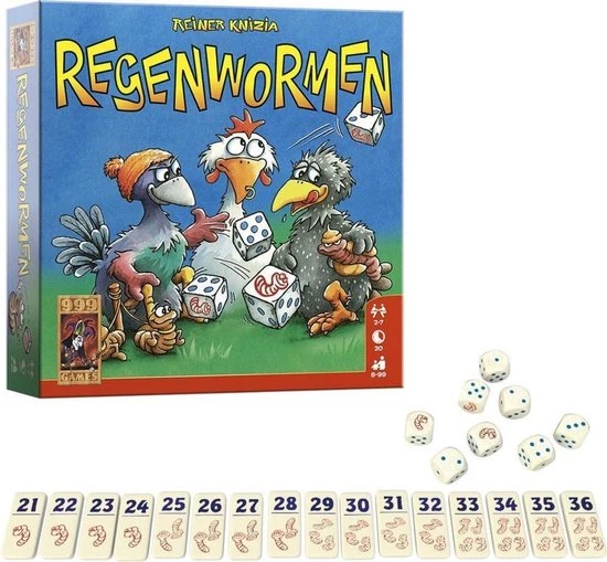 Dit snelle compacte dobbelspelletje Regenwormen kun je op elk moment en overal spelen. Het duurt niet langer dan een half uurtje en het formaat zorgt ervoor dat je het thuis, in de trein of op de campingtafel kunt neerleggen. Iedereen die tot 36 kan tellen, kan meedoen! Als je aan de beurt bent, gooi je met 8 dobbelstenen. Je legt nu alle dobbelstenen met hetzelfde getal of met een worm opzij. Daarna gooi je met de resterende dobbelstenen en legt nu alle dobbelstenen met een ander getal opzij. Als je totaal hoger is dan 20 en je hebt ten minste ??n worm gegooid, mag je de steen met het betreffende getal van tafel of zelfs van een andere speler pakken! Maar neem je teveel risico en gooi je alleen maar getallen die je al eens hebt gepakt, dan ben je af en moet je juist een steen inleveren. Op elke steen staan een aantal regenwormen. Wie aan het einde van het spel de meeste regenwormen heeft, is de winnaar. Probeer Regenwormen nu zelf uit met onze online probeervariant.