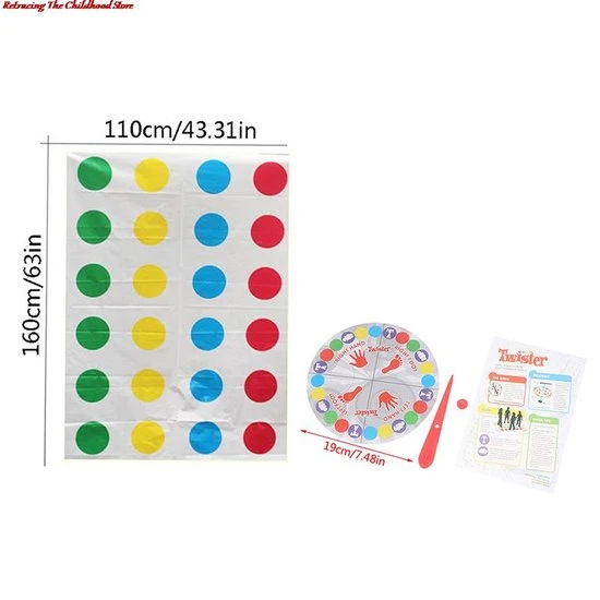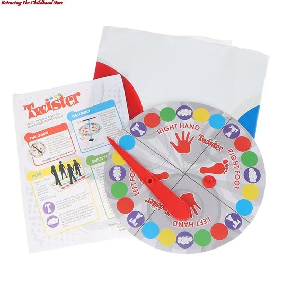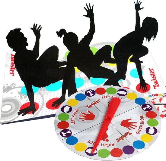 Het orgininele twister spel zoals u hem niet anders kent! Draai aan het bord en laat je medespelers zweten. Linkerbeen op groen, rechterhand op geel… Maak het zo gek als je kunt bedenken. Maar pas op, raak je de mat met iets anders dan je handen of voeten, dan ben je af. Blijf je het langst staan, dan heb je gewonnen!