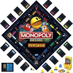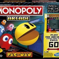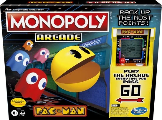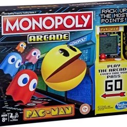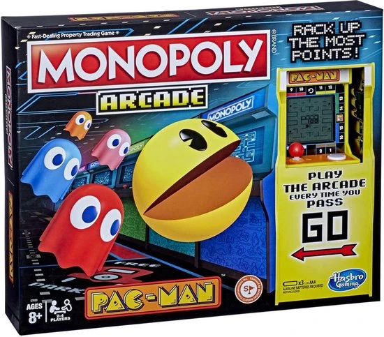 Gamers en fans van de originele Pac-Man kunnen hun speelervaringen herbeleven dankzij dit Monopoly-spel met Pac-Man-thema. In het Monopoly Arcade Pac-Man-bordspel kun je Pac-Man spelen op de retro bank- en speelautomaat, die tegelijk ook dient om levels te kopen, verkopen of stelen en voor verschillende andere acties. Je racet rond het bord om levels te kopen en punten te verdienen (maar kijk uit voor het spook!). Wanneer je langs Start komt, mag je een Pac-Man-minigame spelen. De punten die je binnenhaalt worden bijgehouden in de bank- en speelautomaat zonder dat er contant geld uitgewisseld wordt. De speler met de meeste punten wint!