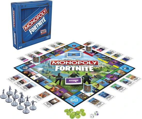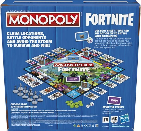 FORTNITE en FORTNITE (gestileerd) zijn handelsmerken van Epic Games, Inc. De Fortnite-afbeeldingen, -verhaalelementen, -personages, specifieke kostuums of ‘outfits’, en gerelateerde designs © 2021 Epic Games, Inc. Fortnite en zijn logo zijn handelsmerken van Epic Games, Inc. in de VS (Reg. U.S Pat. & TM Off) en elders. De namen en logo’s van Hasbro Gaming, Parker Brothers en Monopoly, het kenmerkende ontwerp van het spelbord, de vier hoekvakjes, de naam Mr. Monopoly en het figuurtje, evenals elk van de kenmerkende elementen van het bord en de pionnen zijn handelsmerken van Hasbro voor haar beroemde gezelschapsspel en toebehoren.