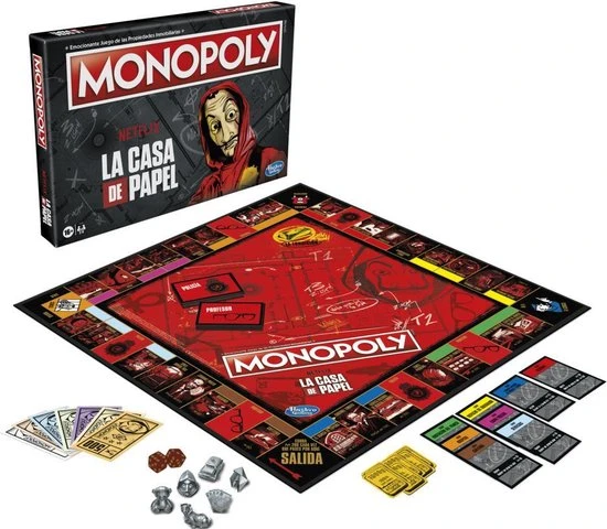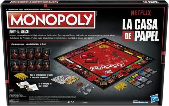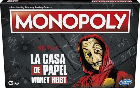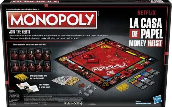 Sluit je aan bij de overvallers in deze Monopoly: Netflix La Casa de Papel-editie van het bordspel, ge?nspireerd op de Netflixserie La Casa de Papel. In deze versie van het Monopolyspel doen spelers mee aan de overval! Kies een personage en gebruik je unieke overvalvaardigheden. Stel daarna als een van de overvallers uit het team van de professor de locaties bij de Koninklijke Spaanse Munt en bank veilig. Weet je de politie te ontwijken en lukt het je ervandoor te gaan met het meeste geld? Monopoly: Netflix La Casa de Papel-editie is een spannend bordspel voor volwassenen en tieners, om te spelen met vrienden. Het spel is voor 2 tot 6 spelers.