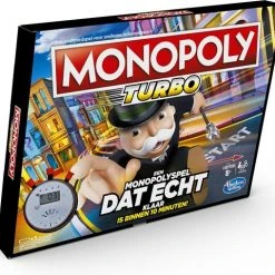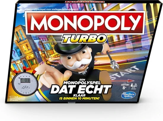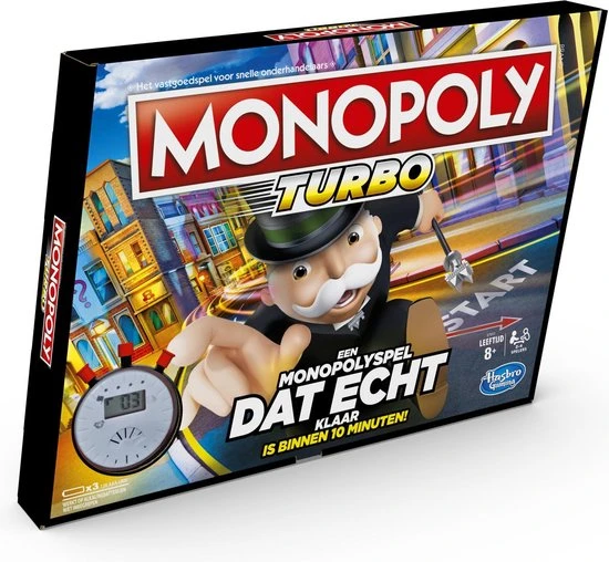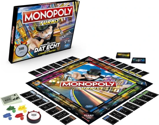 Heb je niet veel tijd? Geen probleem! Het Monopoly Turbo-bordspel duurt amper 10 minuten! Iedereen werpt en koopt tegelijk, dus moeten spelers hun beurt niet afwachten. 4 rondes lang leveren de spelers een race tegen de tijd om eigendommen zo snel mogelijk te kopen, ruilen en verkopen. De timer telt af bij elke koop- en ruilfase en er is geen pauze tussen de fasen. Er zijn zelfs 2 startvakjes en spelers kunnen altijd zonder te betalen uit de gevangenis. Het Monopoly Turbo-bordspel is ideaal voor een gezellige speelavond met familie, feestjes met vrienden of om even de sleur te doorbreken.