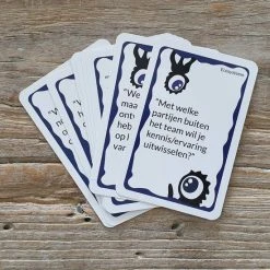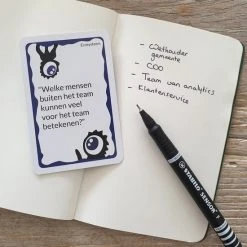 Een team is meer dan de som van de teamleden. Samen werk je aan de doelen van je bedrijf, of je nou verantwoordelijk bent voor de boekhouding, software schrijft of huisbezoeken aflegt. Met dit deck bepaal je samen jullie teamvisie. Wanneer zijn jullie tevreden met je resultaat? Wat vinden jullie fijn als het gaat om samenwerken? En hoe willen jullie kennis borgen? Van proces tot resultaat en nog veel meer: met dit deck til je jullie team naar een hoger niveau!