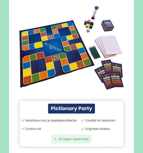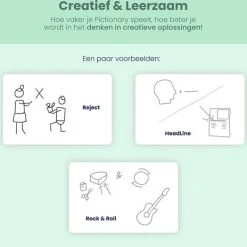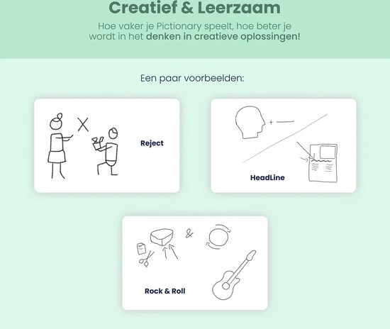 Ontwikkel je creativiteit met Pictionary! Daag elkaar uit en word zo steeds beter in het spel, waarbij je soms creatieve oplossingen moet bedenken om jouw team te laten winnen. Dat maakt Pictionary leuk en leerzaam.