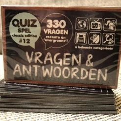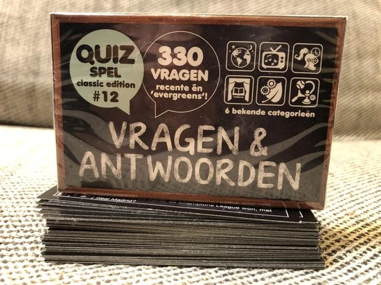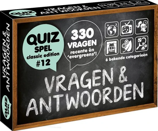 Vragen & Antwoorden – Classic Edition #12 is een pocketformaat (brievenbuspost!) quiz spel (voor 2-6 spelers vanaf 12 jaar) dat zowel als aanvulset / uitbreiding bij andere trivia spellen maar ook als quiz spel op zich gebruikt kan worden. Het spel bevat 55 kaartjes met totaal 330 vragen… zéér recent afgewisseld met ‘evergreens’! De vragen (gemaakt door Marian van Eupen; dé quizvragenmaker van Nederland!) komen uit de 6 bekende categorieën, gemakkelijk herkenbaar aan de icoontjes. Vragen & Antwoorden… hét quizspel van dit moment! Niet in de laatste plaats omdat ze makkelijk tijdens videobellen gespeeld kunnen worden! Het past in iedere broekzak en je kunt het spelen waar jij maar wilt (ook via videobellen!). Er bestaan inmiddels alweer 14 edities! Het trivia spel heeft geen ingewikkeld spelmechanisme. Je gaat gewoon lekker elkaars kennis testen.
