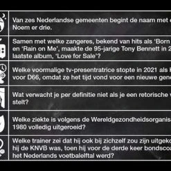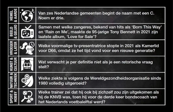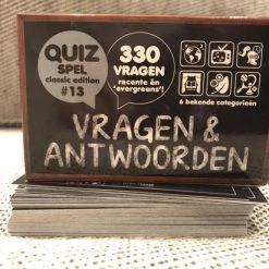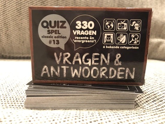 Vragen & Antwoorden – Classic Edition #13 (nieuwe Nederlandse vragen 2021 !) is een pocketformaat (brievenbuspost!) quiz spel (voor 2-6 spelers vanaf 12 jaar) dat zowel als aanvulset / uitbreiding bij andere trivia spellen maar ook als quiz spel op zich gebruikt kan worden. Het spel bevat 55 kaartjes met totaal 330 vragen… z??r recent afgewisseld met ‘evergreens’! De vragen (gemaakt door Marian van Eupen; d? quizvragenmaker van Nederland!) komen uit de 6 bekende categorie?n, gemakkelijk herkenbaar aan de icoontjes. Vragen & Antwoorden… h?t quizspel van dit moment! Niet in de laatste plaats omdat ze makkelijk tijdens videobellen gespeeld kunnen worden! Deze weetjes zijn ook ideaal voor je eigen pubquiz. Het past in iedere broekzak en je kunt het spelen waar jij maar wilt. Er bestaan inmiddels alweer 14 edities! Het trivia spel heeft geen ingewikkeld spelmechanisme. Je gaat gewoon lekker elkaars kennis testen.