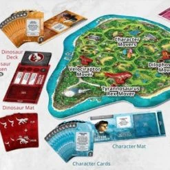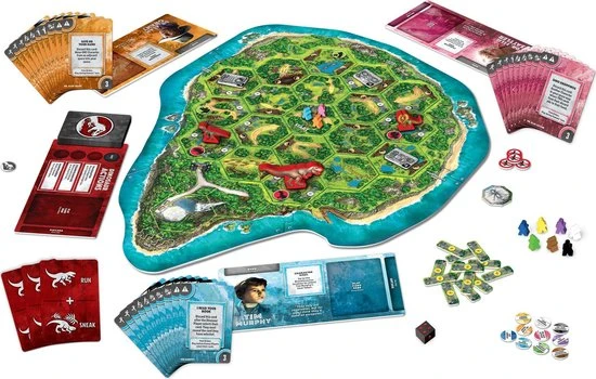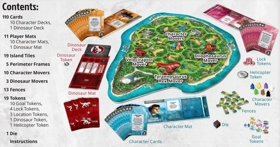 1 spelbord, 110 kaarten, 11 personagekaarten, 19 eilandtegels, 5 omtrekframes, 10 karakters, speelbaar 1 T. Rex, 1 Dilophosaurus en 1 Velociraptor, 32 tokens, 1 dobbelsteen en instructies.